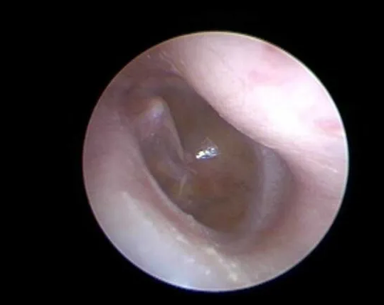 图(鼓膜置管术前,右侧鼓膜内陷呈琥珀色,鼓室内充满积液,外耳道骨部前壁向后膨隆,致使外耳道深处近鼓膜处略狭窄。)
