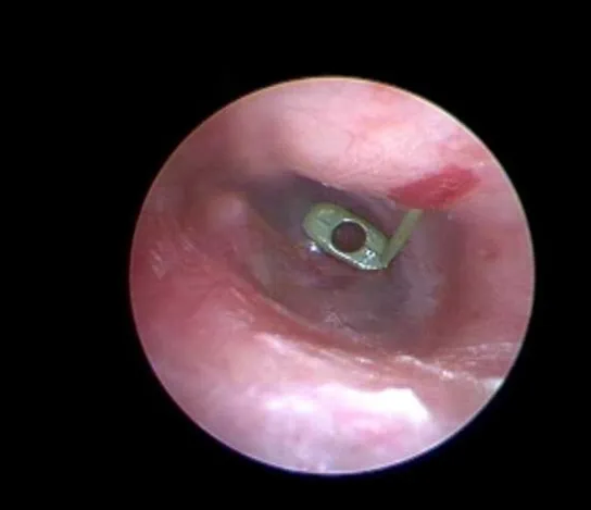 图(鼓膜置管术后,鼓室内积液已吸除,于鼓膜前上象限切开鼓膜后植入通气管(T管)。)